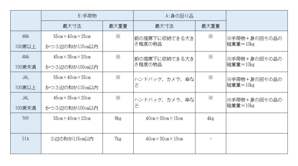 以下に,私が良く利用する航空会社のエコノミークラスの機内持ち込み手荷物のサイズなどをまとめました.